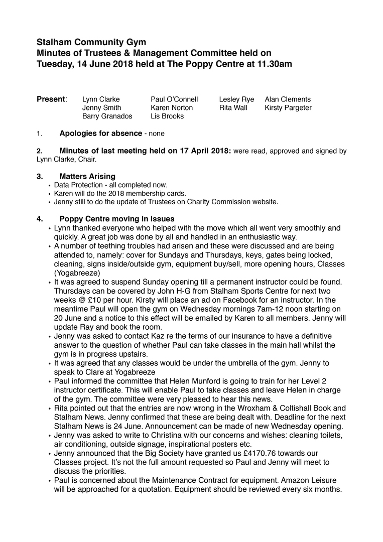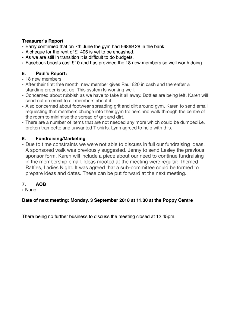 fully out and operational. It is becoming more difficult where certain members need his full attention and this is conflicting with preparing the gym for opening. It was suggested that Paul gently